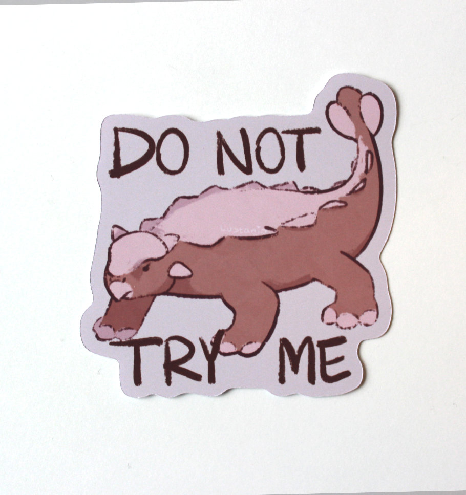 Vinyl sticker of a Ankylosaurus with the phrase “Do not try me” on it.