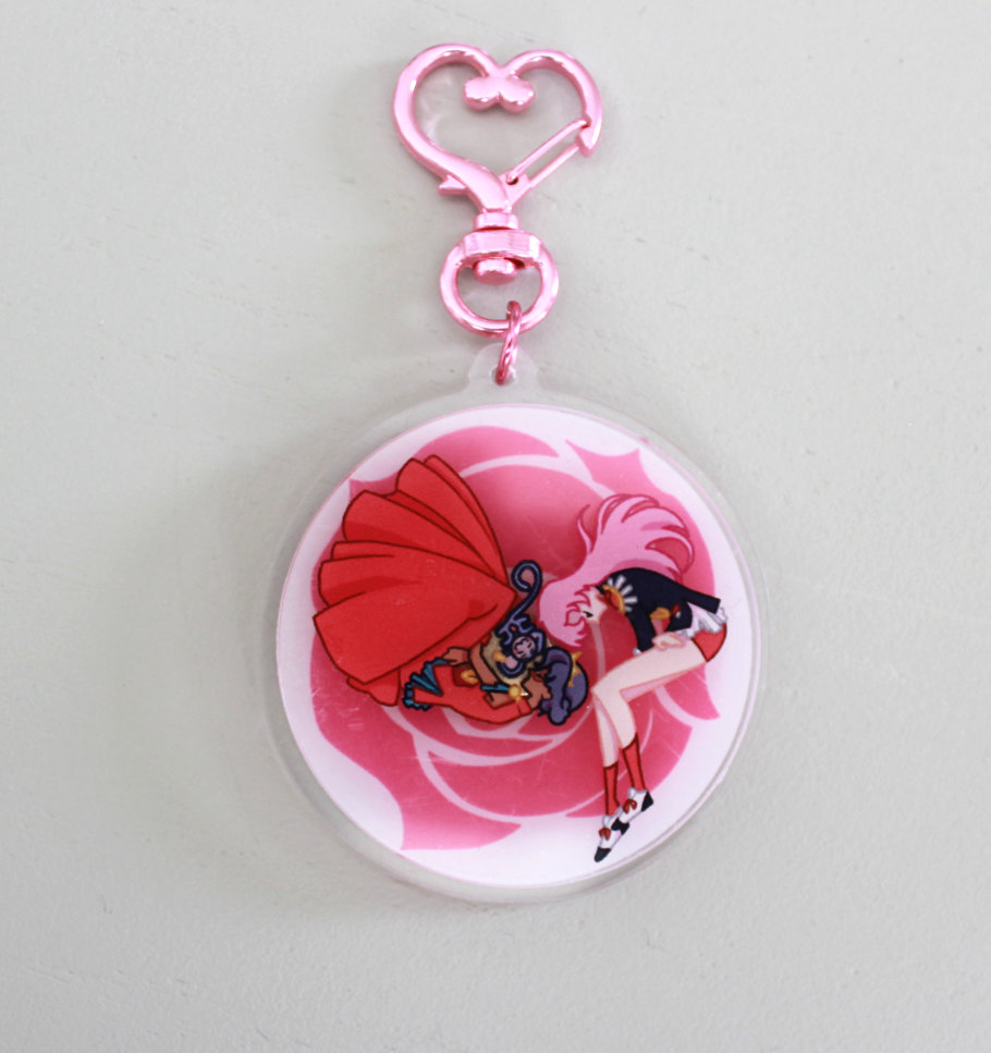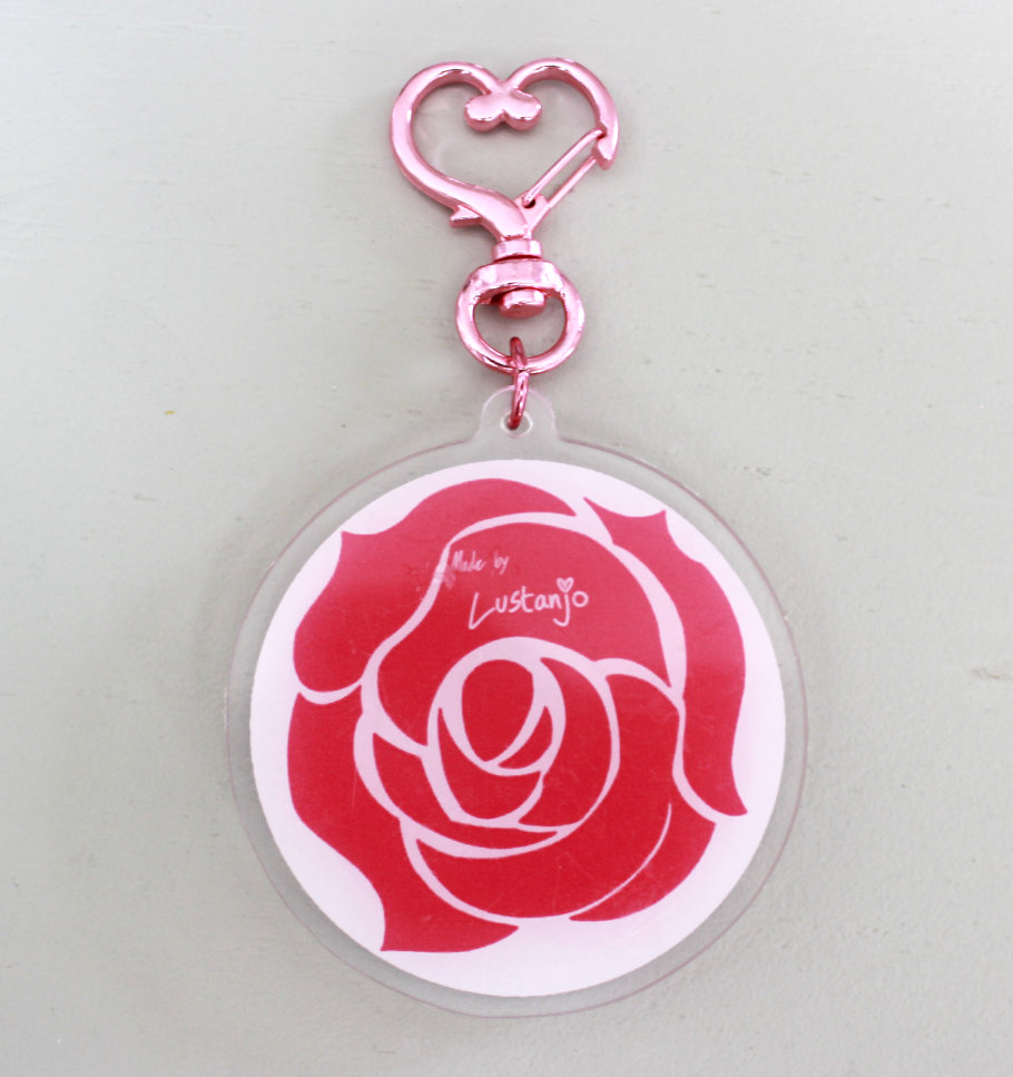 6.5cm double sided acrylic keychain on opaque white acrylic.