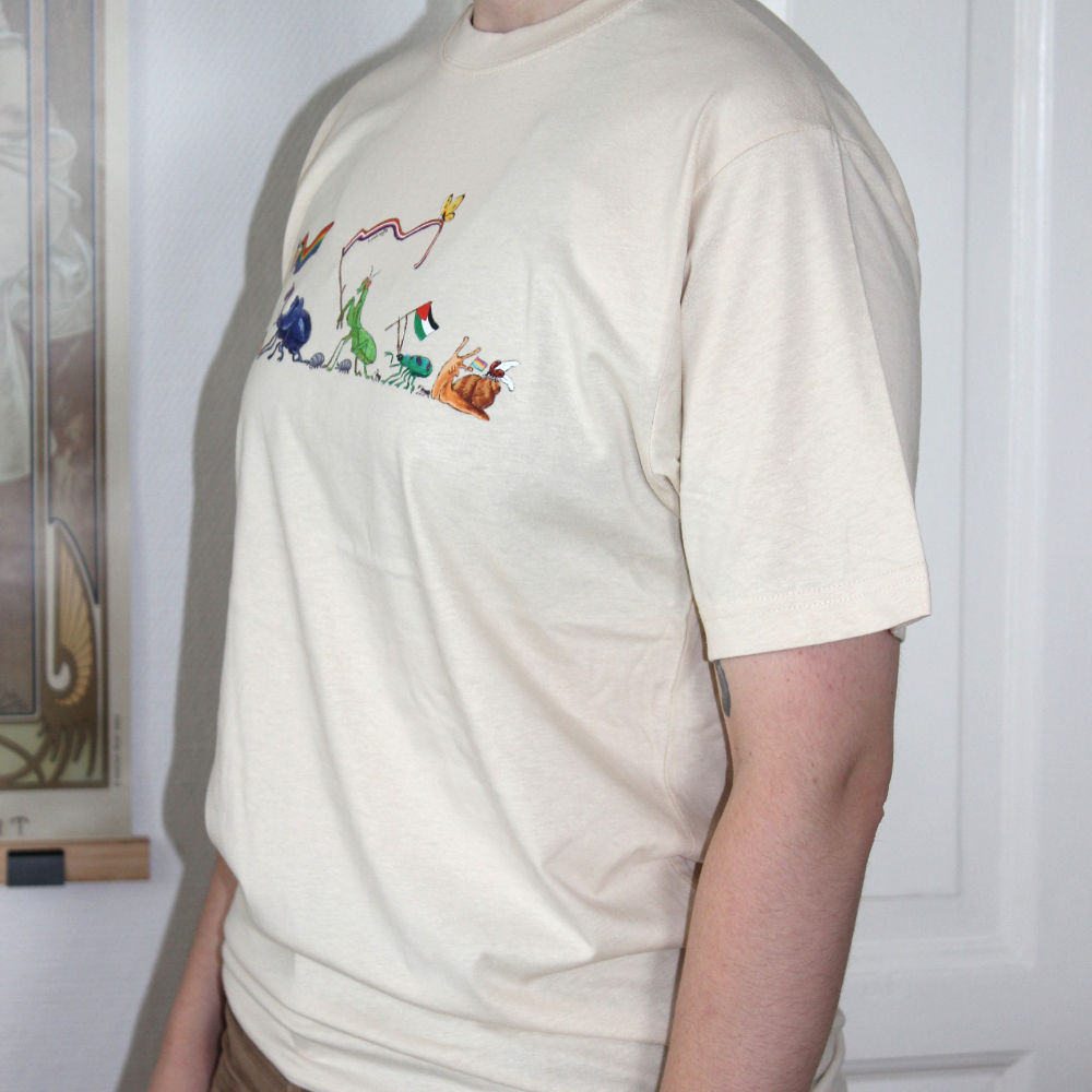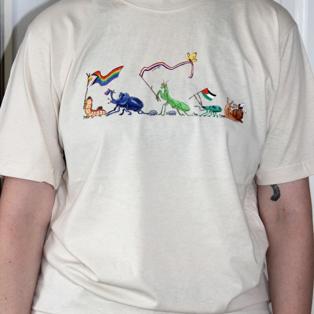 A beige colored t-shirt with a DTF print on of bugs walking in a Pride Parade.