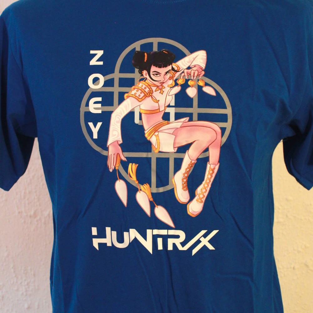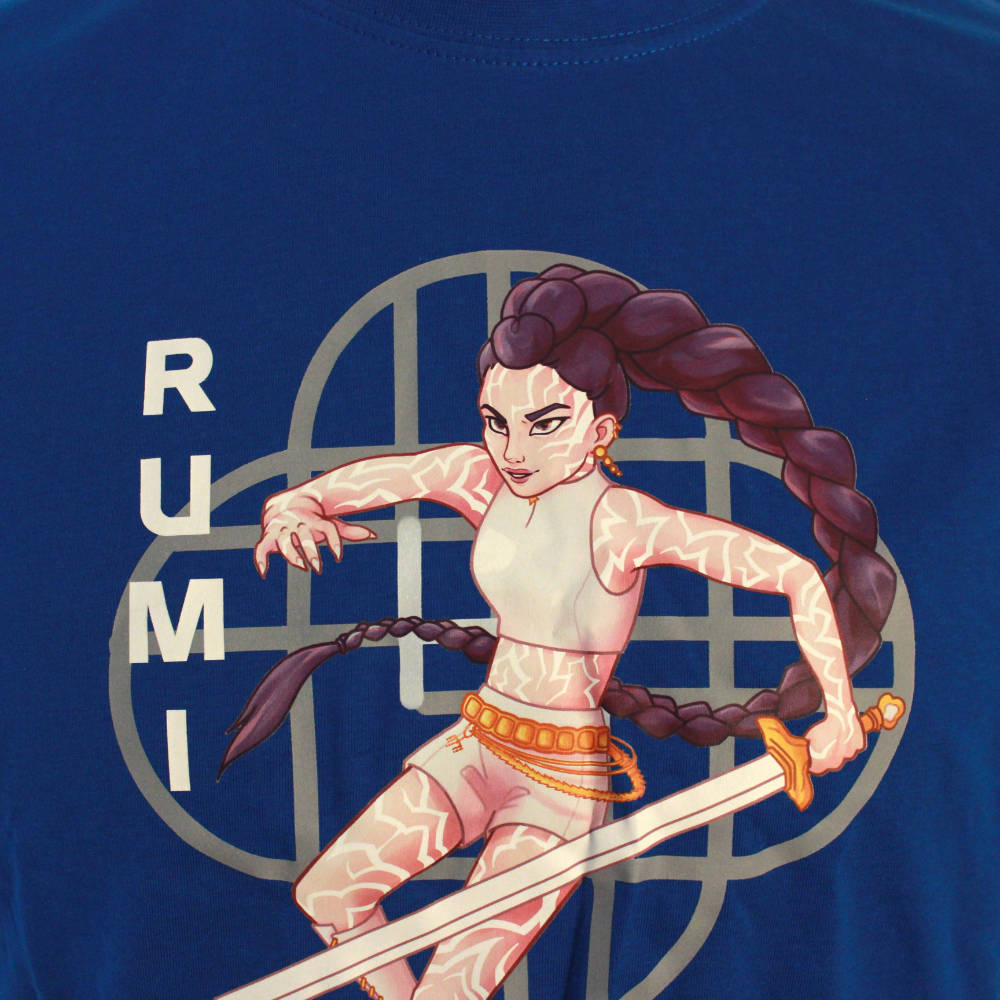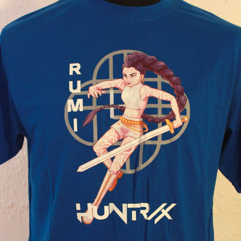 A blue colored t-shirt with a DTF print on of the Huntirx members from the movie “K-pop Demon Hunters”.