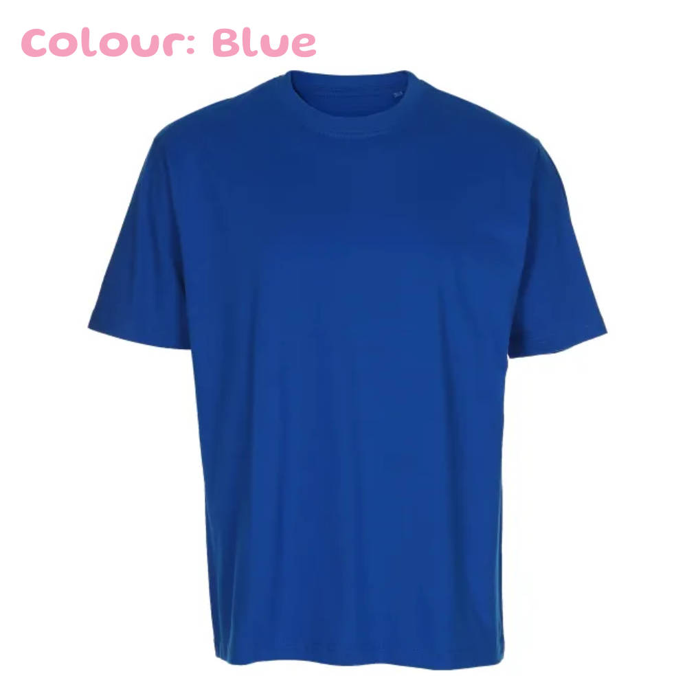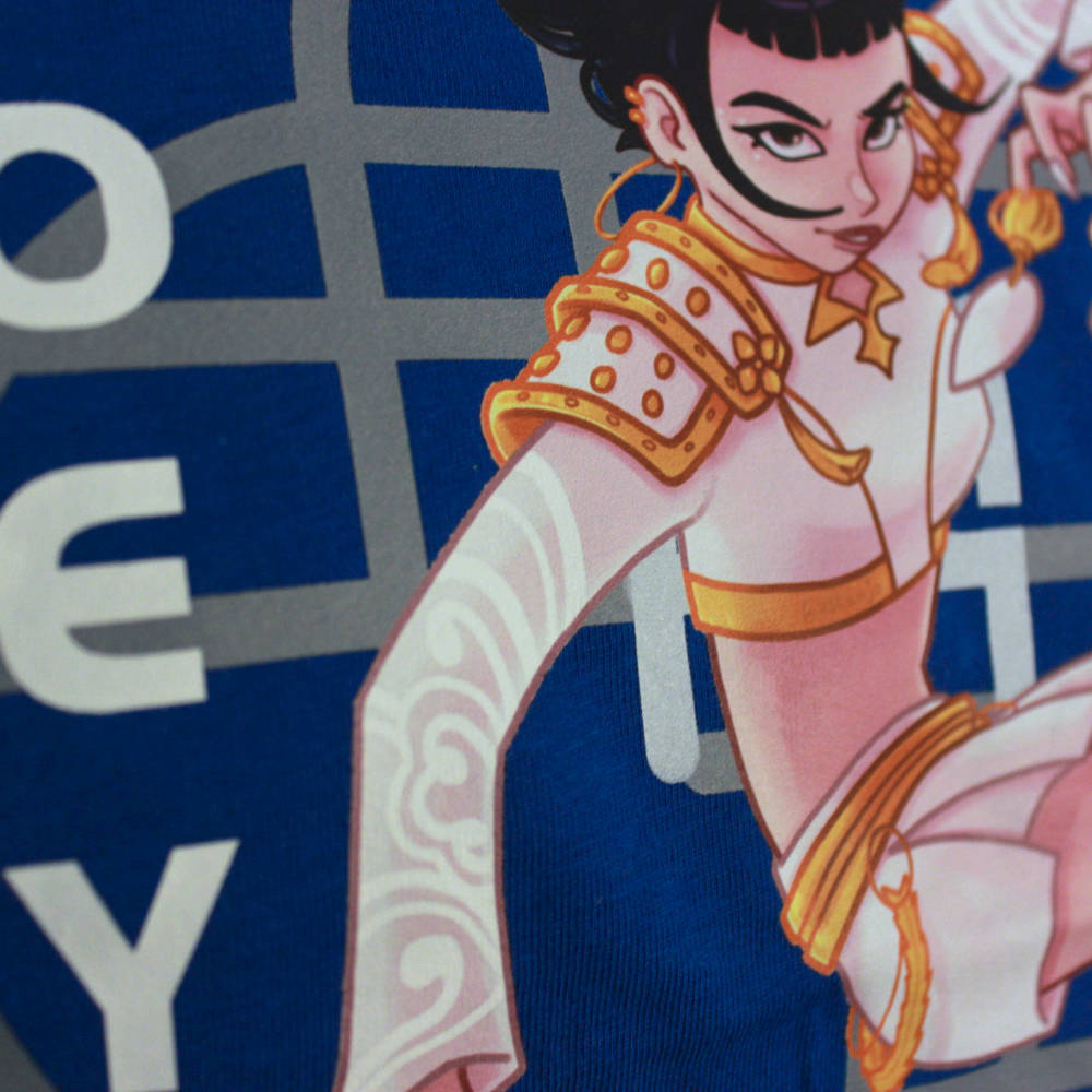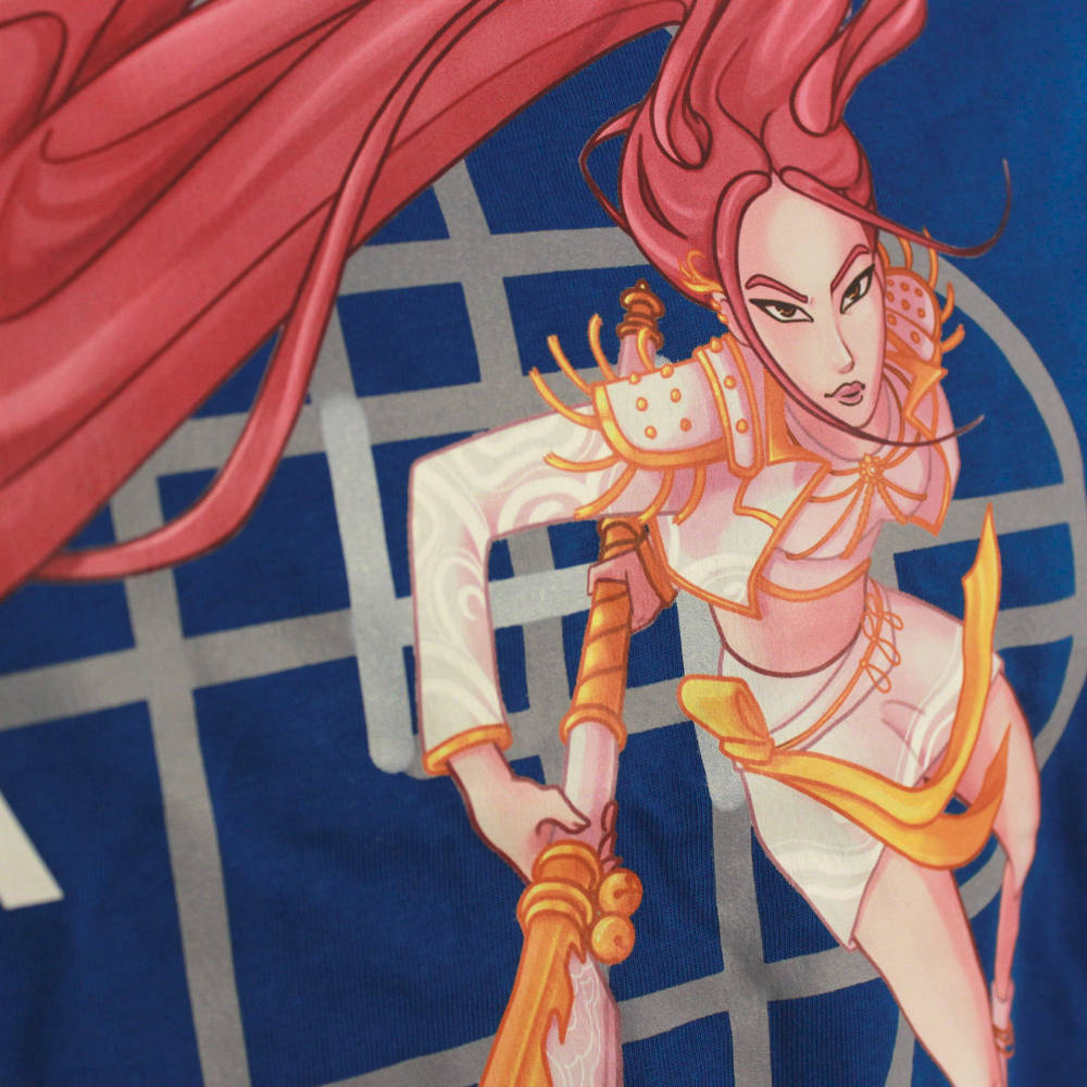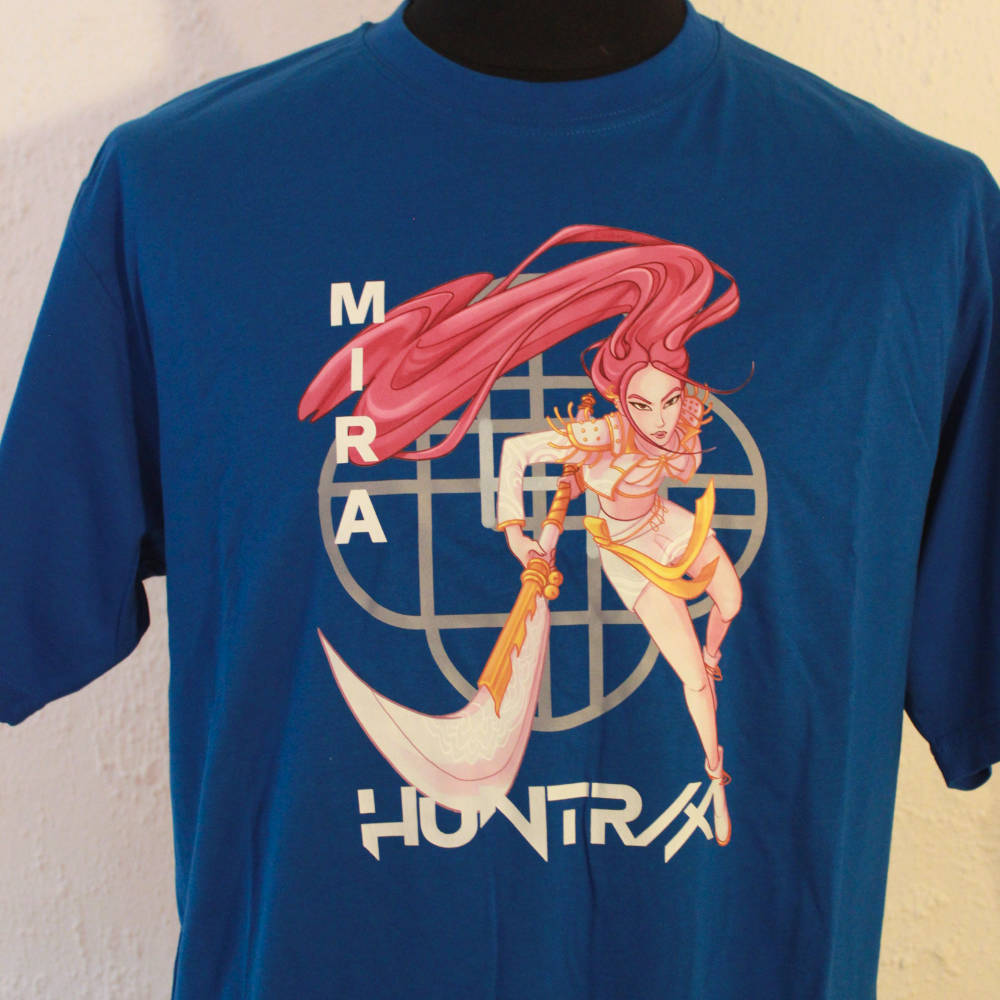 A blue colored t-shirt with a DTF print on of the Huntirx members from the movie “K-pop Demon Hunters”.