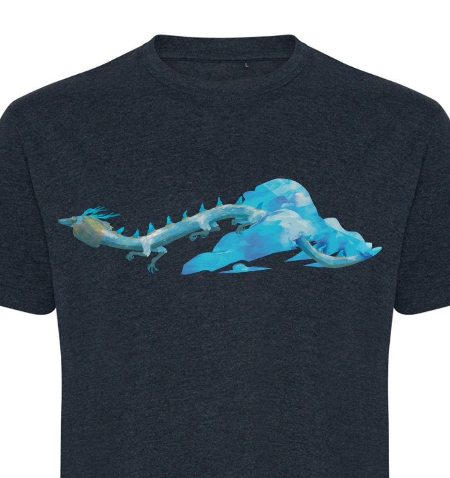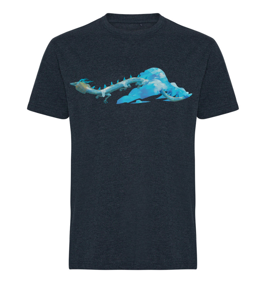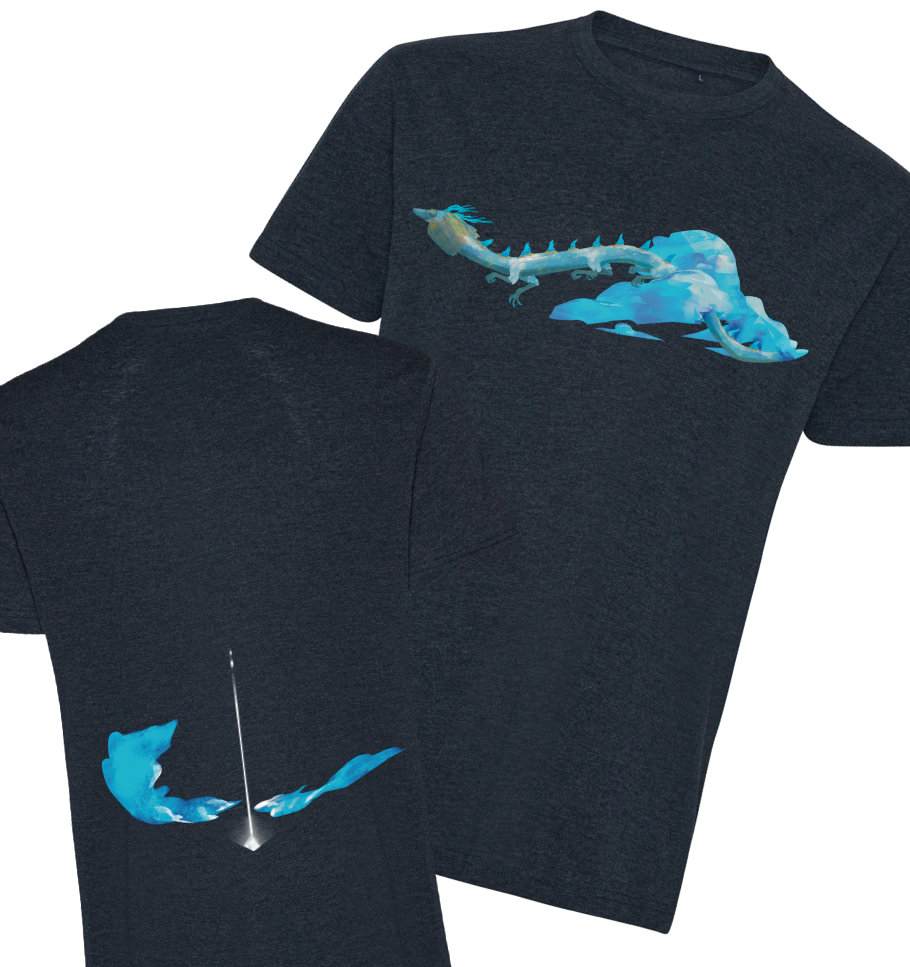 A Heather Navy colored t-shirt with a DTF print on of the light dragon from Zelda Breath of the Wild on the front, and a fallen star fragment light and clouds on the back.